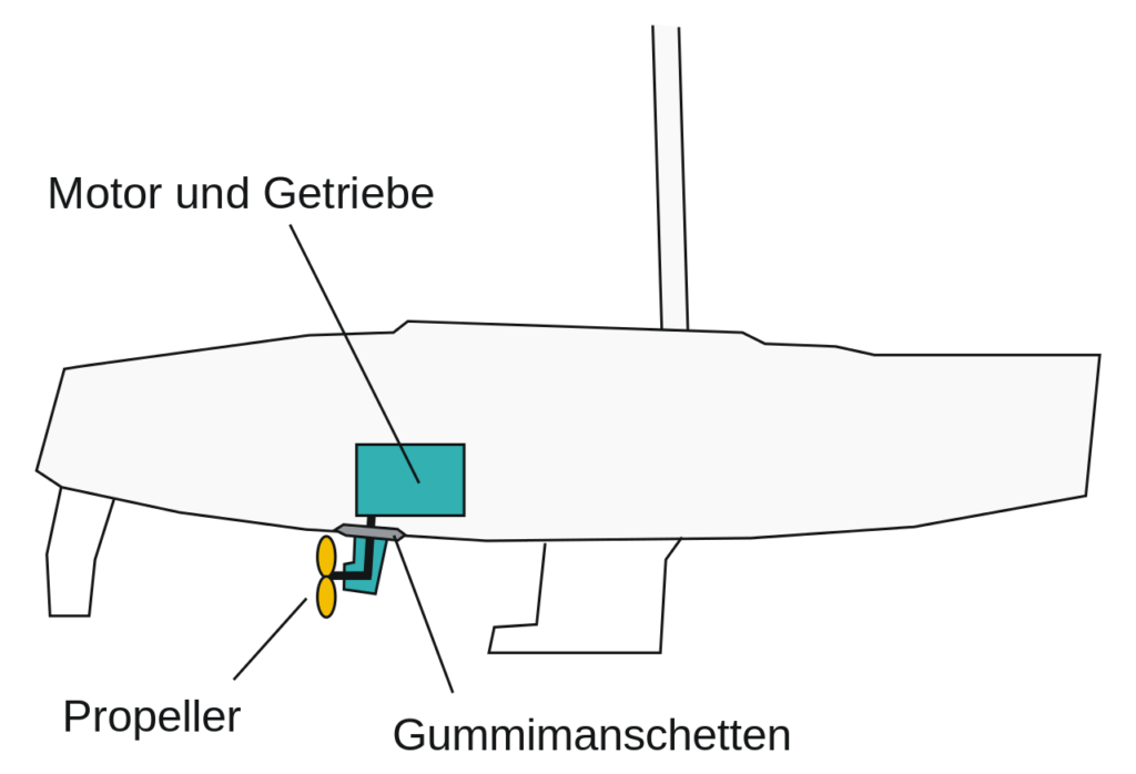 Vom Motor, der im Rumpf der Yacht eingebaut ist, führt ein fest angeflanschter Schaft mit einer Antriebswelle (Propellerwelle) senkrecht nach unten und tritt an einer Öffnung im Schiffsrumpf aus. Zwischen Schaft und Rumpf sind Gummimanschetten angebracht, die zur Abdichtung des Rumpfs dienen. Am Schaftende wird die Antriebswelle rechtwinklig umgelenkt und tritt horizontal aus dem Schaft aus.